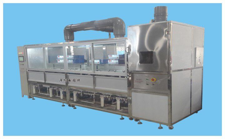 VGT-709FHA為偏光鏡超聲波清洗機,設備共有七個工位,配置有循環過濾系統、自動恒溫系統、觸摸屏系統、拋動系統、超聲波清洗系統、預熱箱系統、溢流系統、自動智能式機械手系統等。設備采用水溶劑洗滌、純水漂洗,為環保型清洗機。